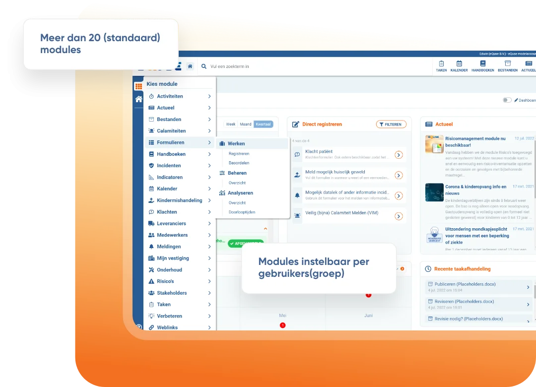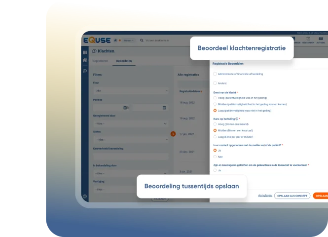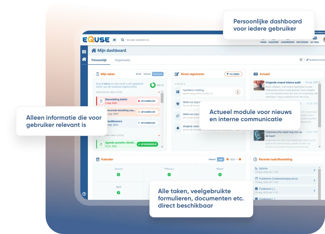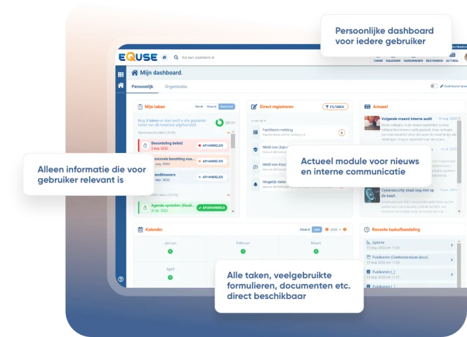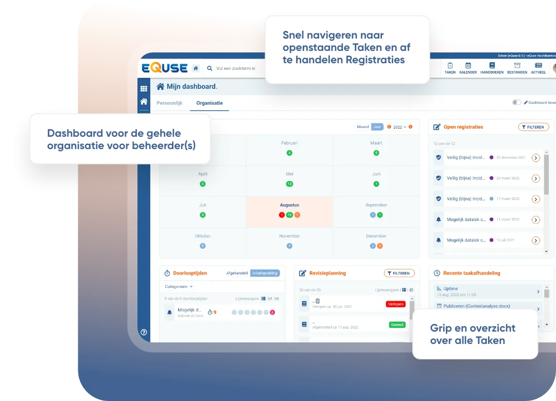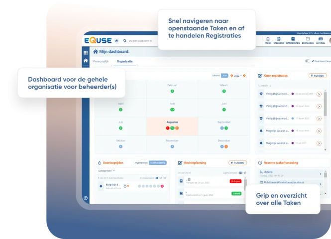 Zie Equse als het geweten van uw organisatie. Het helpt u in kaart brengen van bijvoorbeeld klachten, zaken op orde houden voor audits en het bewaakt belangrijke momenten. - Zet iedereen in hun kracht